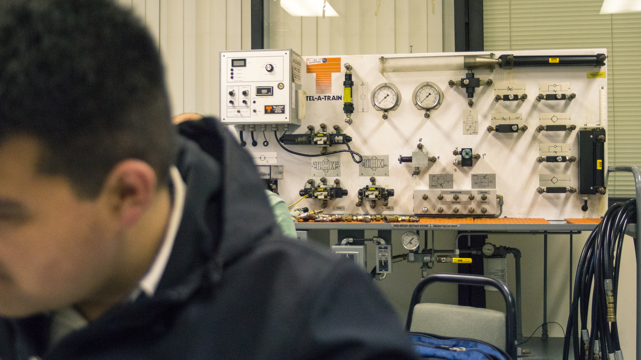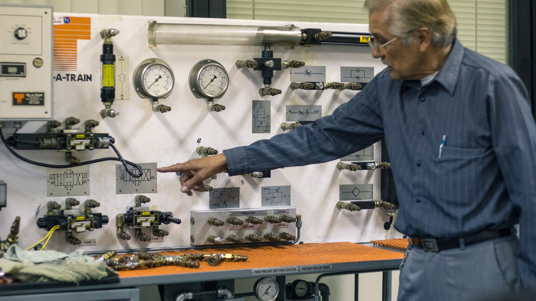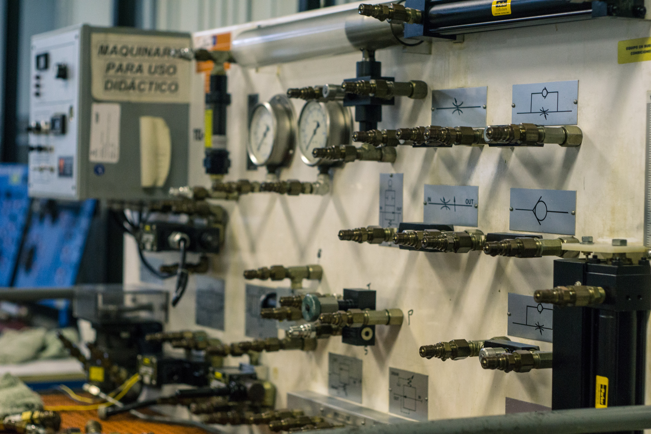 Mesa de trabajo con instrumentación hidráulica Parker.