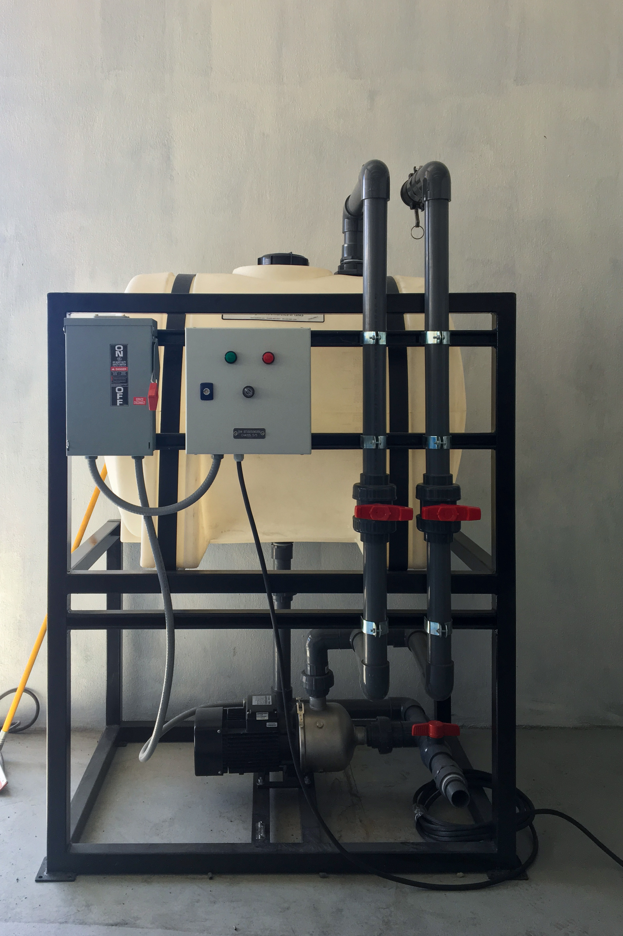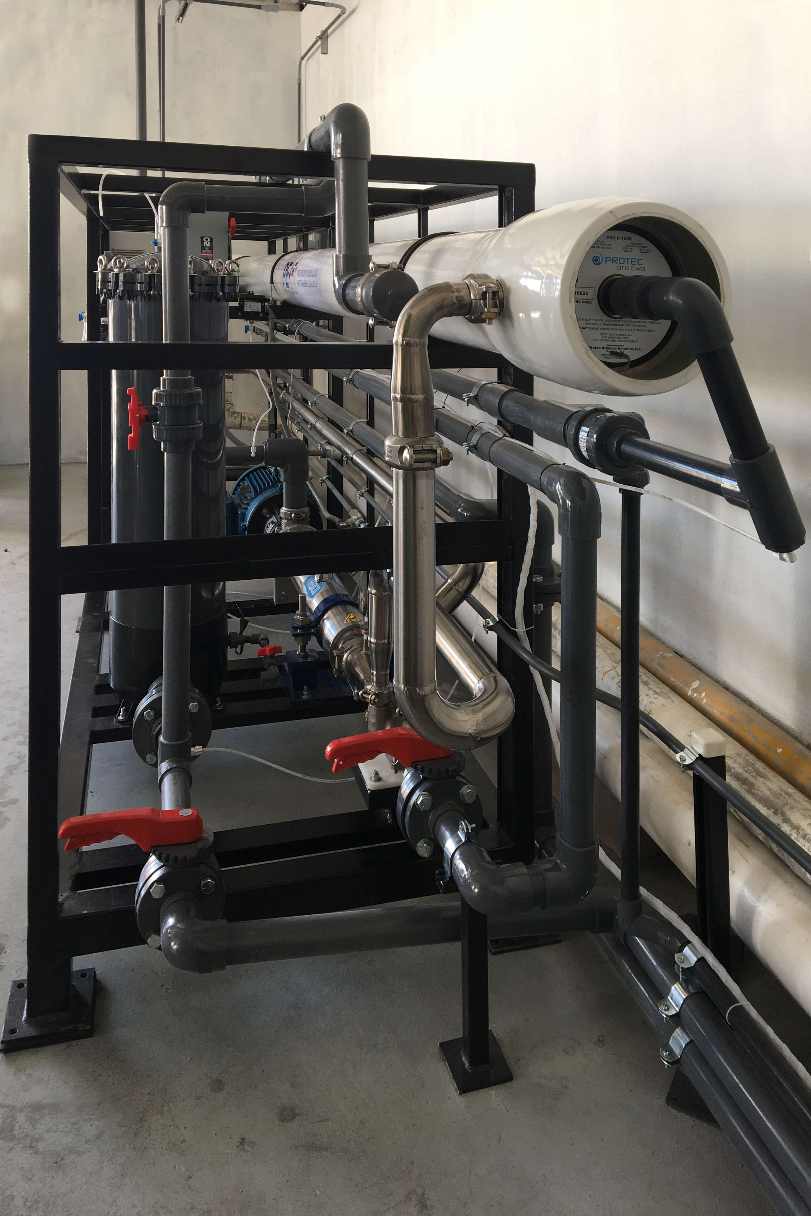 Provisto con una bomba booster de 30 hp y con una turbina de recuperación de energía, este equipo logra alcanzar presiones superiores a los 720 psi para una producción mayor a los 20 gpm de agua de hasta 32,000 ppm de TDS, proveniente del mar, alcanzando una recuperación máxima de 35% de agua producto.